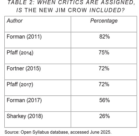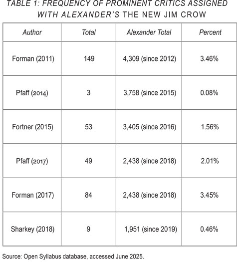 Powerful scholarly challenges to The New Jim Crow mounted in the years following Forman's article. These, as Table 1 shows, were ignored as well. One is the work of John Pfaff, a law professor at Fordham University. In 2014, he authored "Escaping from the Standard Story: Why the Conventional Wisdom on Prison Growth Is Wrong, and Where We Can Go from Here" in the Federal Sentencing Reporter. Pfaff showed that prison growth was not primarily caused by the war on drugs, as Alexander contended. Pfaff's article, though, has been almost entirely ignored by those who teach The New Jim Crow. It has been assigned with Alexander's book in only three courses in the OS database. Perhaps this oversight is understandable, though, since Pfaff's article attracted less scholarly attention than Forman's did.